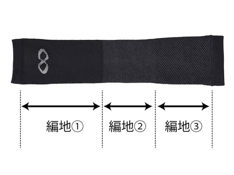 上腕、肘、前腕の3つのエリアに分けて編地を変えることで、柔らかいのにズレ落ちにくい構造を実現。